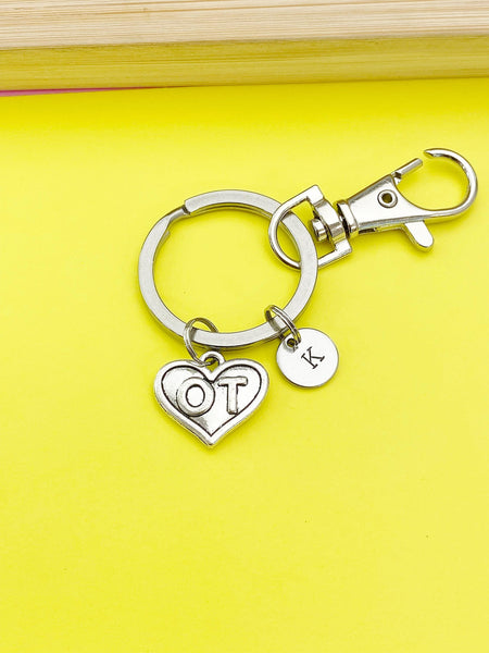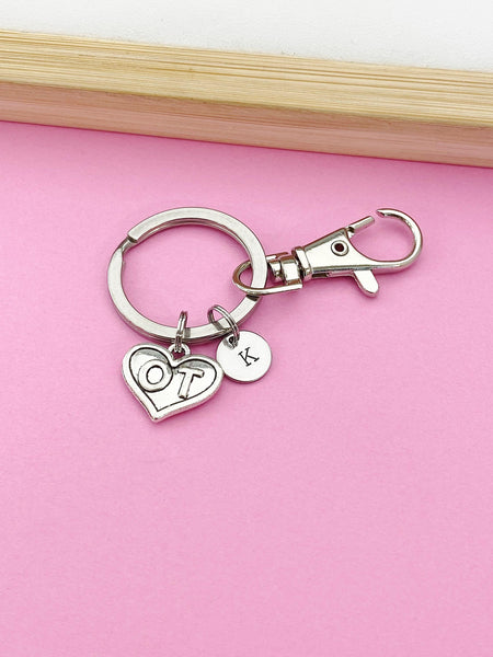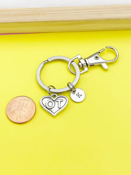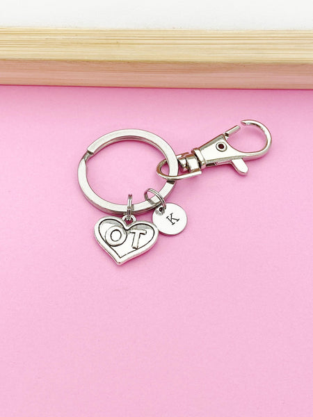 This is a silver-tone OT Heart charm with hand stamped initial charm on keyring.