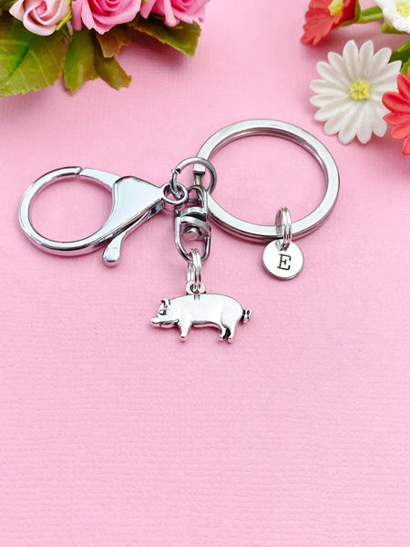 This is a gold or silver-tone pig charm with hand stamped initial charm on keyring.