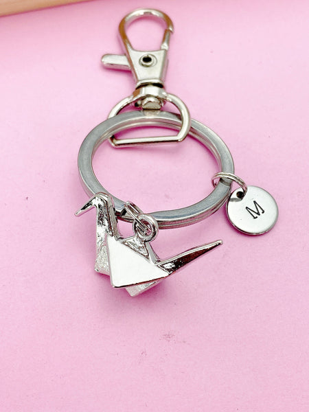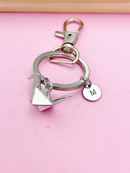 This is a silver-tone Origami Crane charm with hand stamped initial charm on keyring.