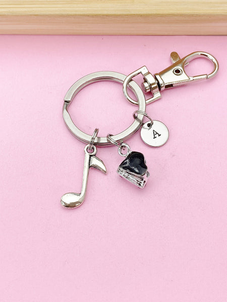 This is a silver tone music note and piano charm with hand stamped initial charm on keyring.