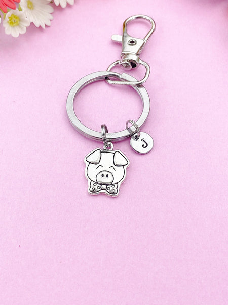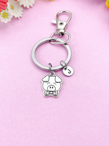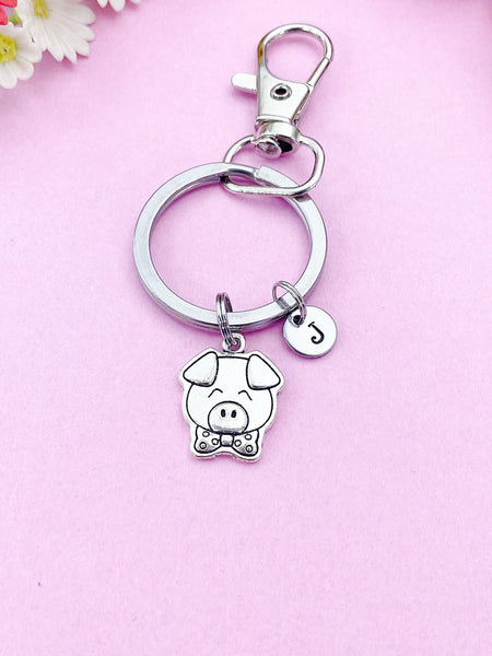 This is a silver-tone pig charm with hand stamped initial charm on keyring.