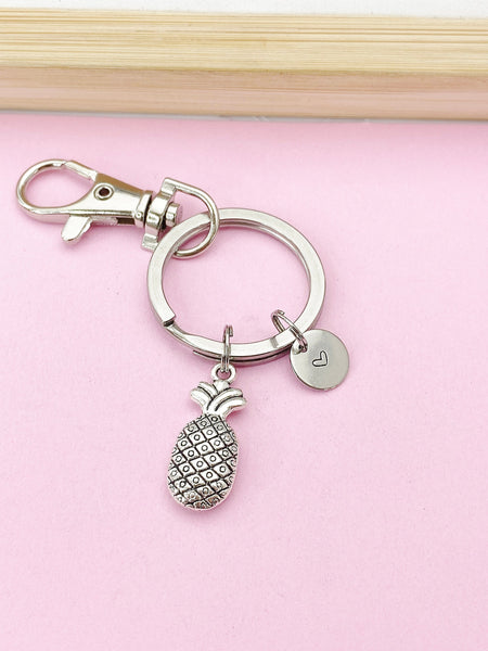 This is a silver-tone Pineapple charm with hand stamped initial charm on keyring.