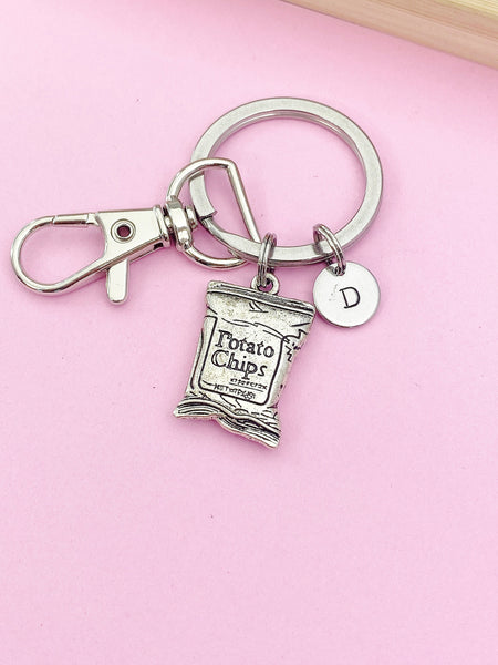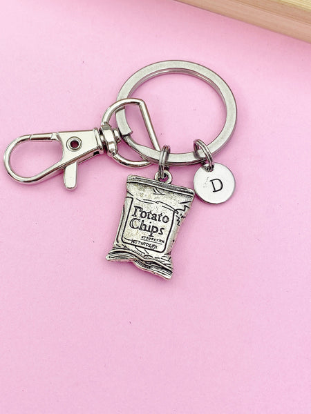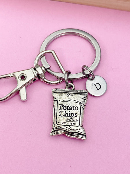 This is a silver tone potato chips bag charm with hand stamped initial charm on keyring.