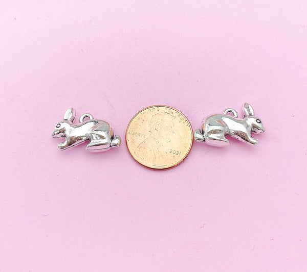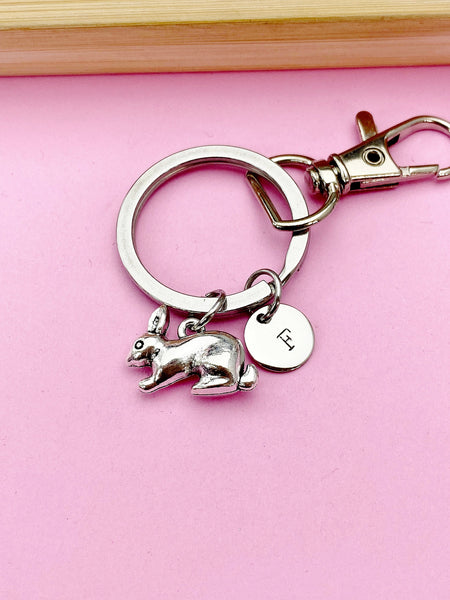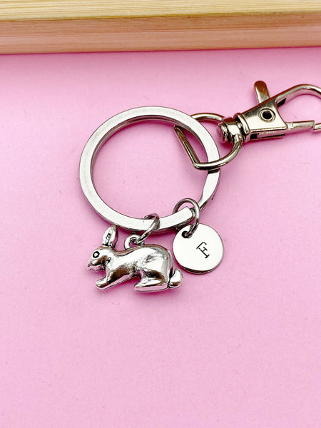 This is a silver-tone rabbit charm with hand stamped initial charm on keyring.