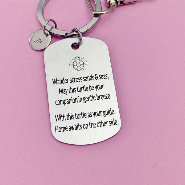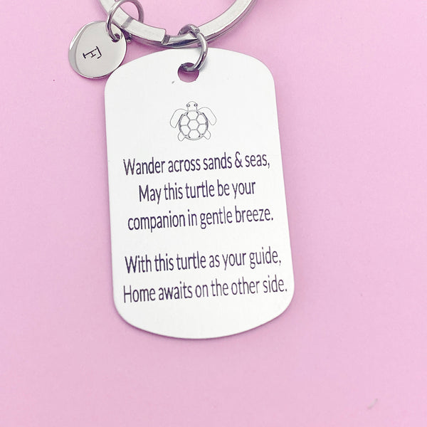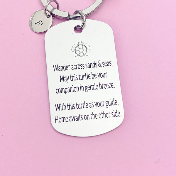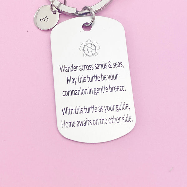 This is an engraving turtle travel on stainless steel pendant with hand stamped initial charm on keyring.