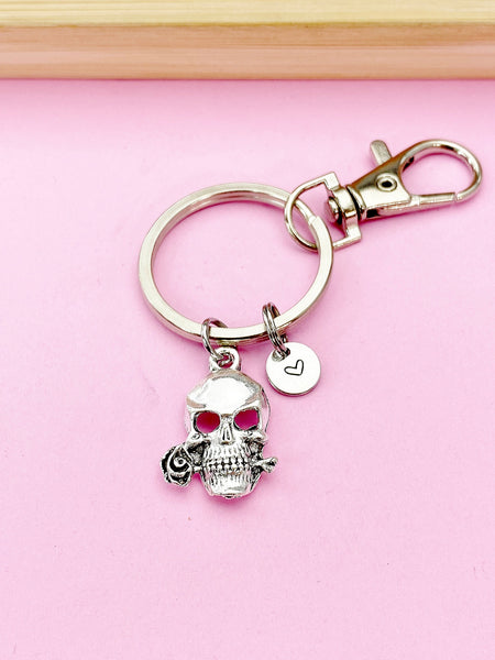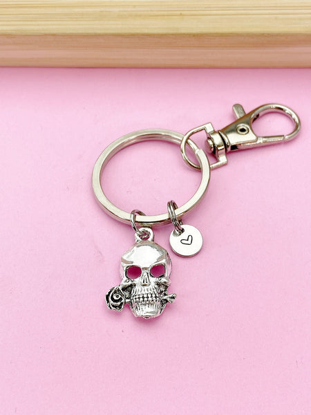 This is a silver-tone skull with rose charm with hand stamped initial charm on keyring.