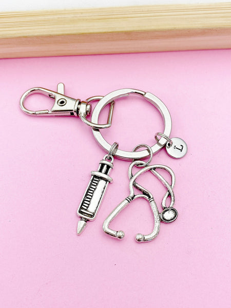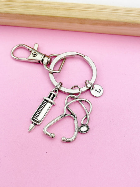 This is silver-tone alloy syringe and stethoscope charm with hand stamped initial charm on keyring.