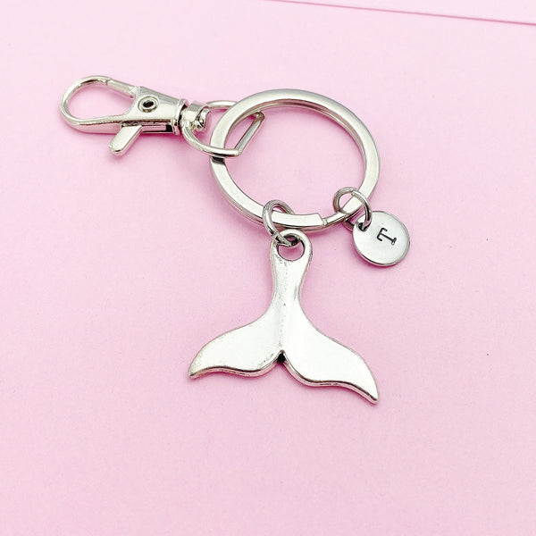 This is a silver-tone mermaid tail charm with hand stamped initial charm on keyring.