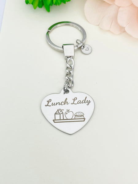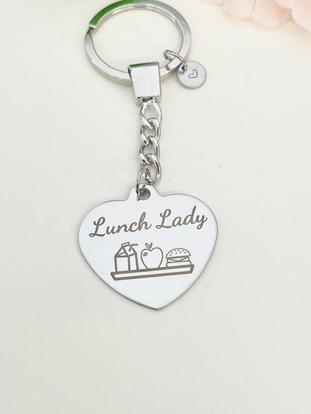 This is an engraving Lunch Lady on stainless-steel with hand stamped initial charm on stainless steel keyring.