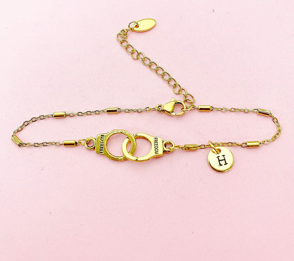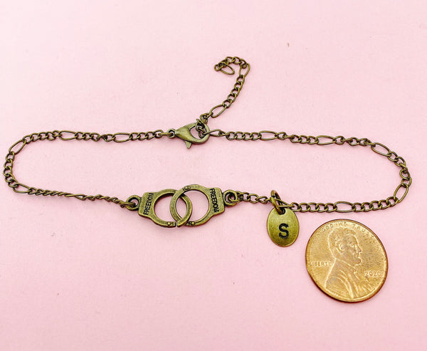 This is a bronze-tone handcuff charm with hand stamped initial charm on bras or stainless-steel chain,