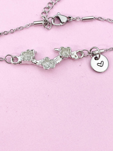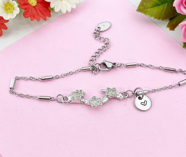 This is a silver tone flower charm with hand stamped initial charm on brass/stainless steel chain.