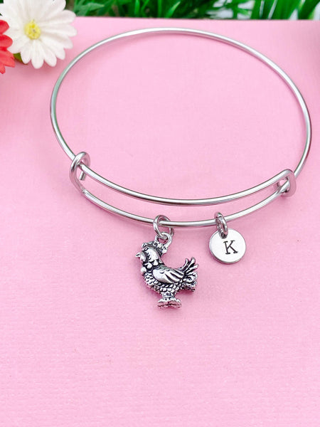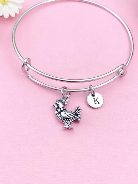 This is a silver-tone rooster charm with hand stamped initial charm on stainless steel bracelet bangle.