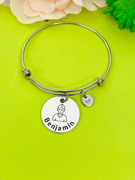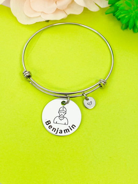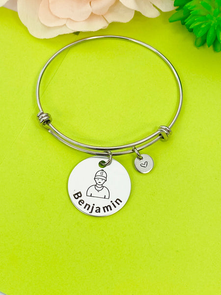 This is an engraving Coach and name on stainless-steel or aluminum with hand stamped heart charm on stainless steel bangle or necklace or split key ring optional.