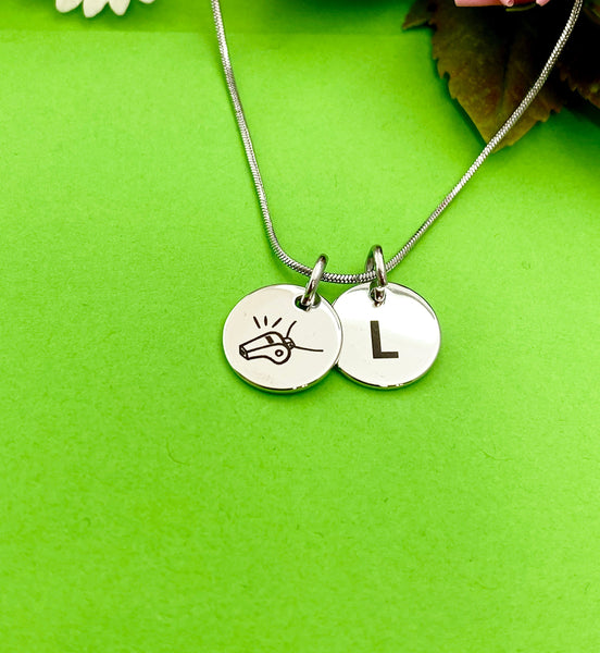 This is an engraving Whistle and Initial on stainless-steel or brass charm on stainless steel bangle or necklace or split key ring optional.