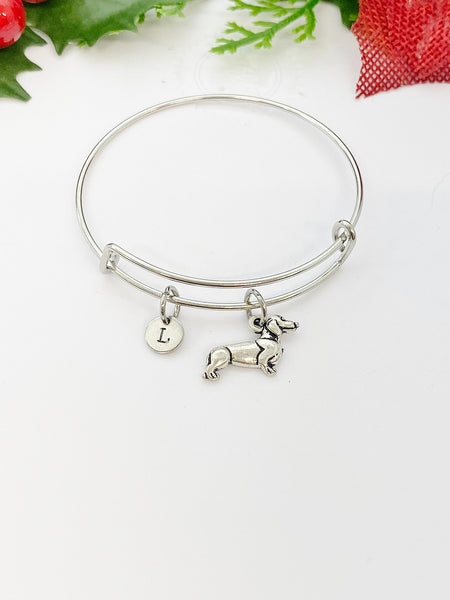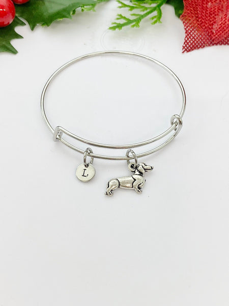 This is a silver -tone Dachshund dog charm with hand stamped initial charm on 18 inches chain or bangle.