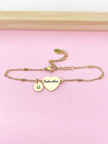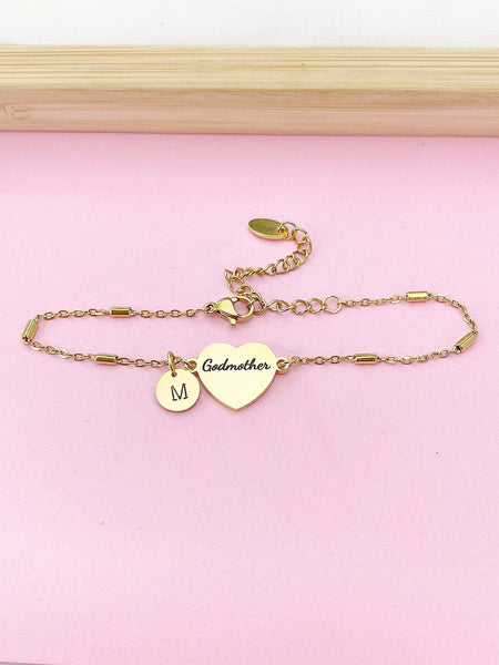 This is an engraving Godmother on stainless steel with hand stamp Initial charm on stainless-steel bracelet.