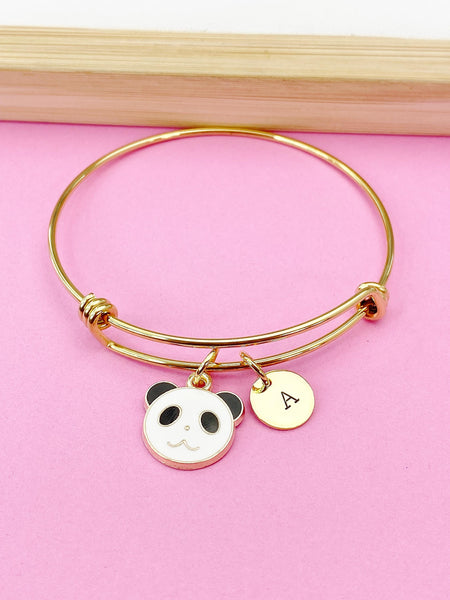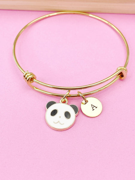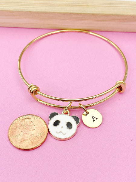 Panda Bracelet, Gold Cute Panda Charm Bangle, Personized Initial Bracelet,