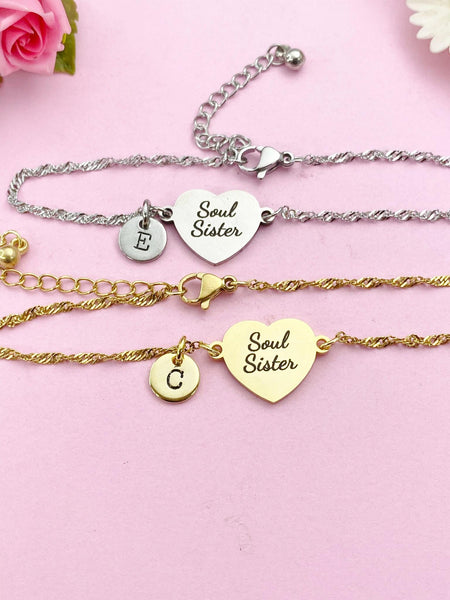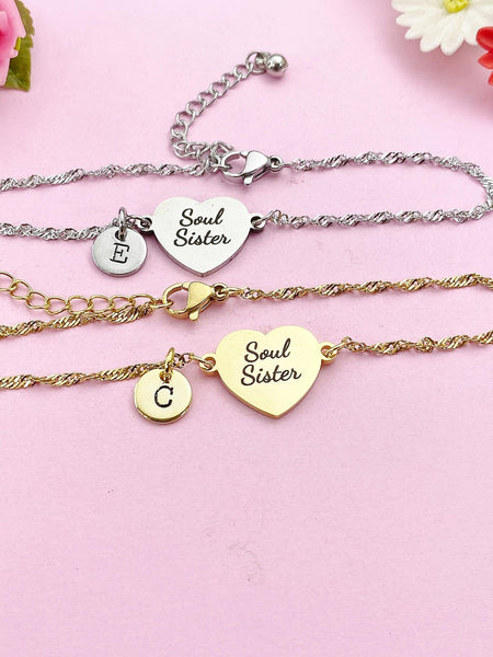 This is an engraving Soul Sister on stainless steel with hand stamp Initial charm on Tarnish Resistant stainless-steel bracelet.