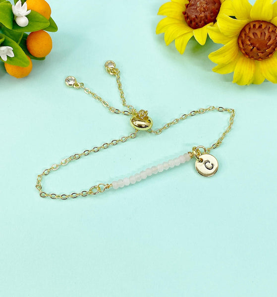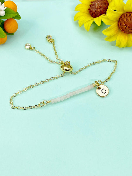 This is a gold tone Natural Rose Quartz with hand stamped initial charm on stainless steel chain.