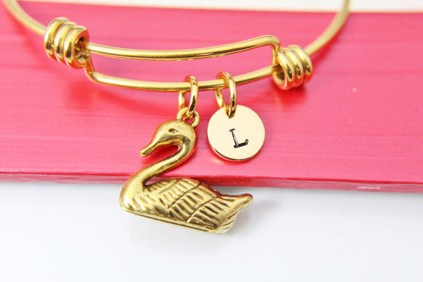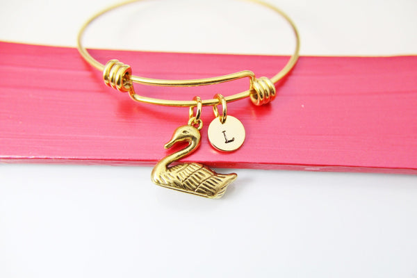 This is a swan charm with hand stamp initial on stainless steel bangle.