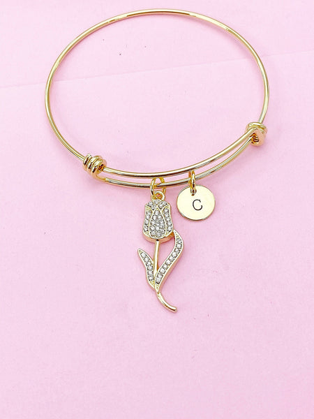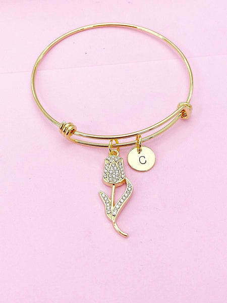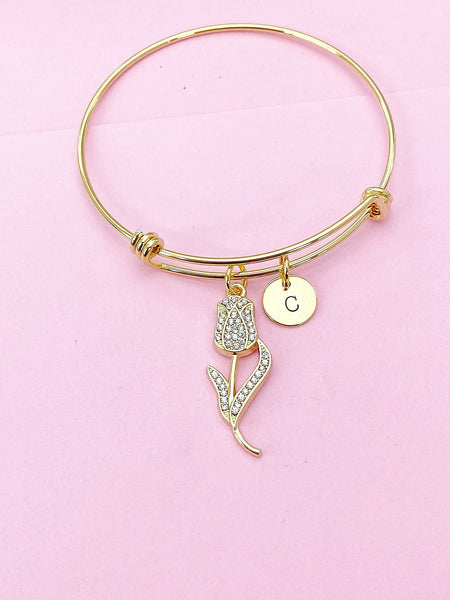This is a gold tone Tulip charm with hand stamped initial charm on stainless steel bracelet.