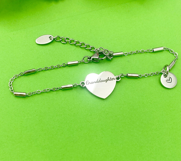 This is an engraving Granddaughter on stainless steel with hand stamp Initial charm on stainless-steel bracelet.