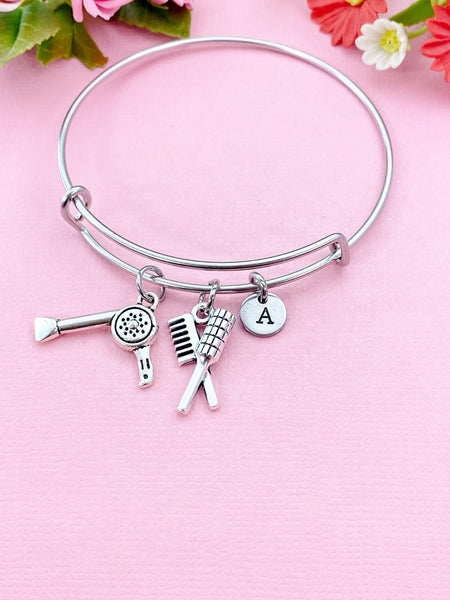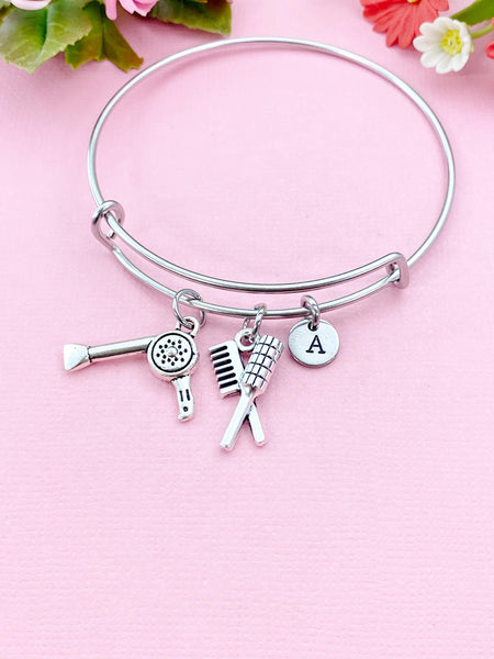 This is a silver-tone comb, hair dryer charm with hand stamped initial charm on Tarnish Resistant stainless steel bracelet.