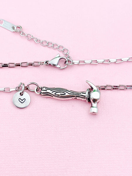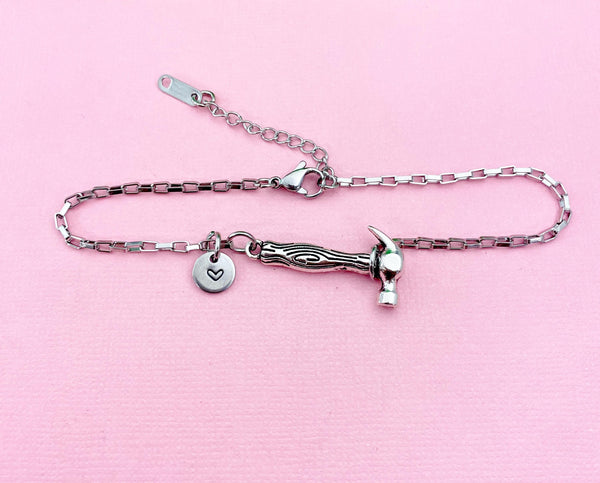 This is silver tone hammer charm with hand stamp Initial charm on stainless-steel bracelet.