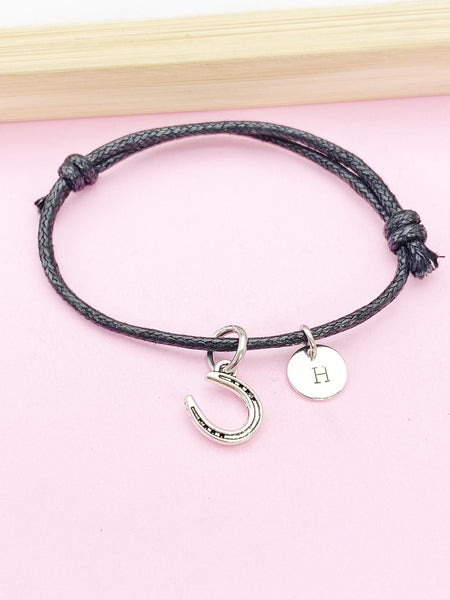 This is a silver-tone horsshoe charm with hand stamped initial charm on Adjustable Waxed Cord Bracelet.