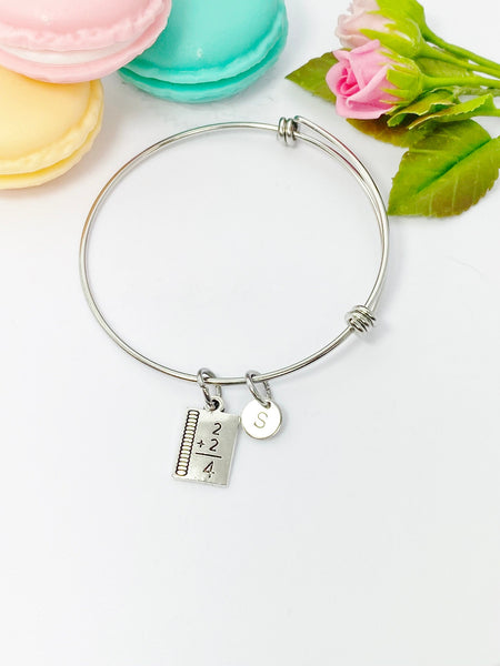 This is a silver-tone math book charm with hand stamped initial charm on 18 inches chain or bangle.