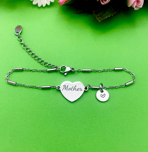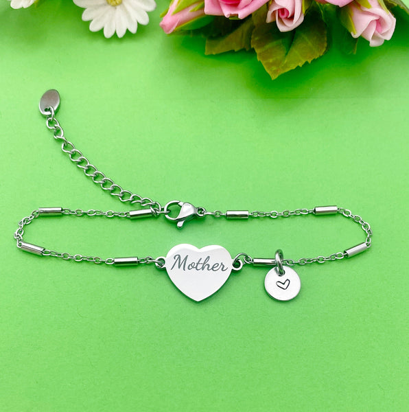 This is an engraving Mother on stainless steel with hand stamp Initial charm on stainless-steel bracelet.