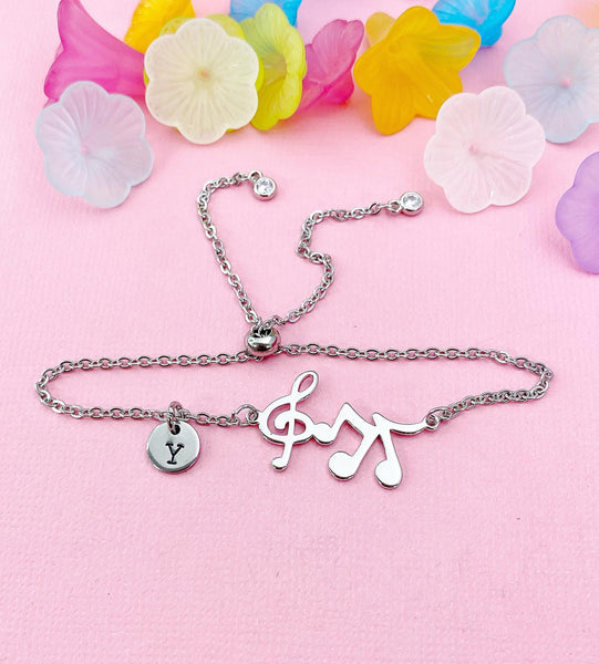 This is a silver-tone music note charm with hand stamped initial charm on tarnish resistant stainless-steel bracelet.