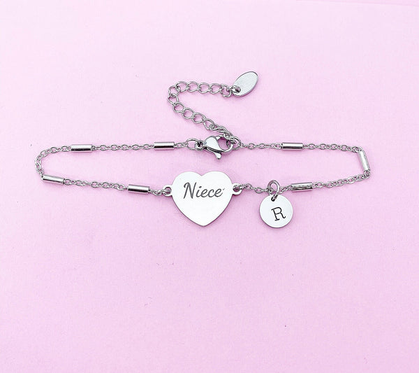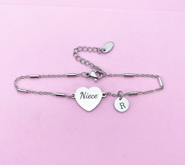 This is an engraving Niece on stainless steel with hand stamp Initial charm on stainless-steel bracelet.