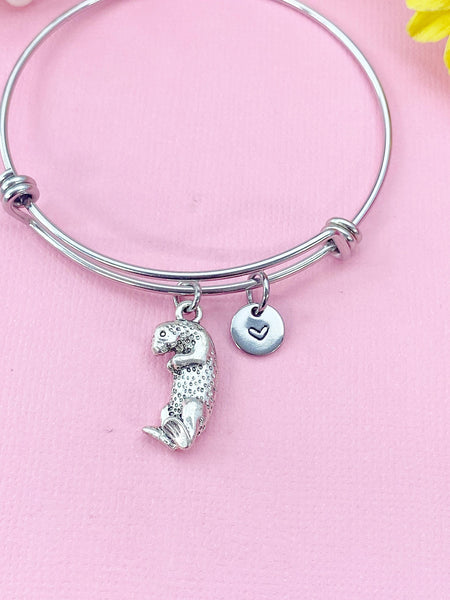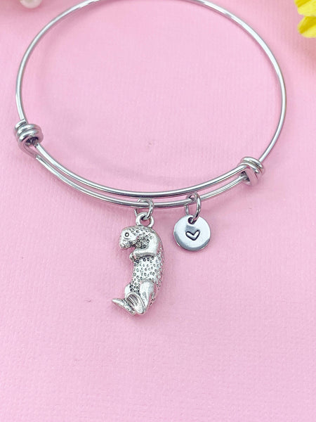 This is silver tone otter charm with hand stamped initial charm on brass/stainless steel 18 inches chain or bracelet or keyring.