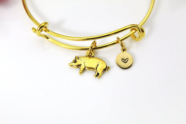 This is a gold-tone pig charm with hand stamp initial stainless steel charm on an expandable bangle. You able to choose initial from a drop-down menu.
