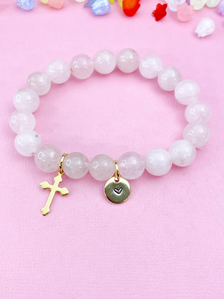 This is a gold or silver tone Natural Rose Quartz with cross and hand stamped initial charm on stretch bracelet.