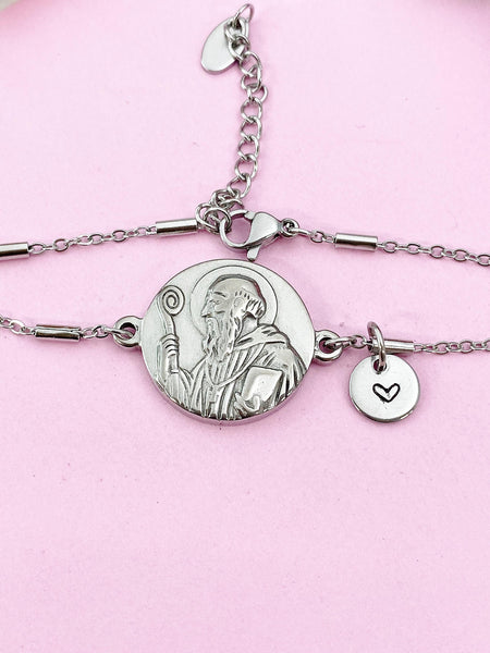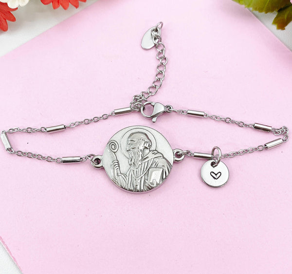Saint Benedict Medal Charm Silver Bracelet, Saint with Spiral Cane, N6231