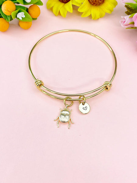 This is a gold or silver-tone Scarab charm with hand stamped initial charm on tarnish resistant stainless-steel bracelet.