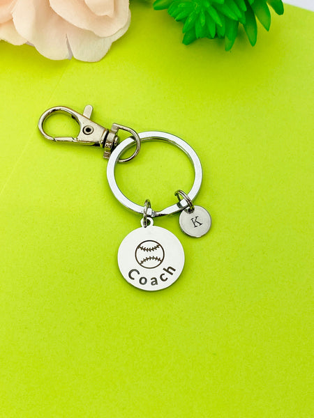 This is an engraving Baseball Coach on stainless-steel or aluminum with hand stamped initial charm on stainless steel bangle or necklace or split key ring optional.