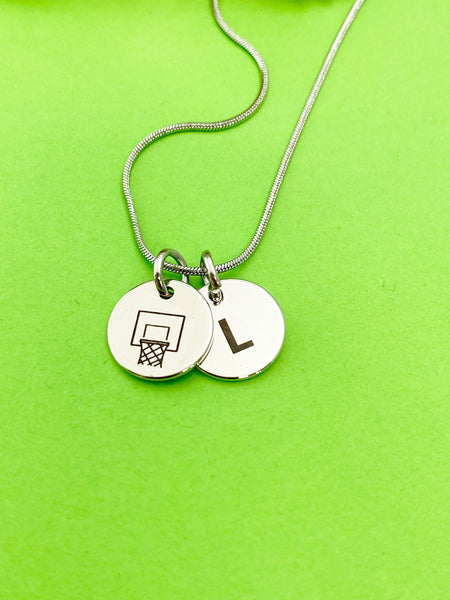 This is an engraving Basketball Hoop and Initial on stainless-steel or brass charm on stainless steel bangle or necklace or split key ring optional.