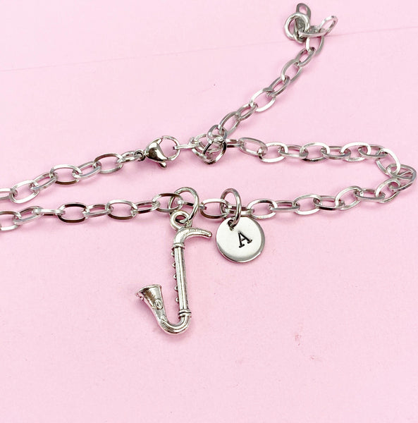 This is a silver-tone Bass Clarinet charm with hand stamped initial charm on Tarnish Resistant stainless steel chain.