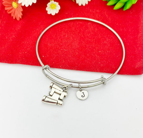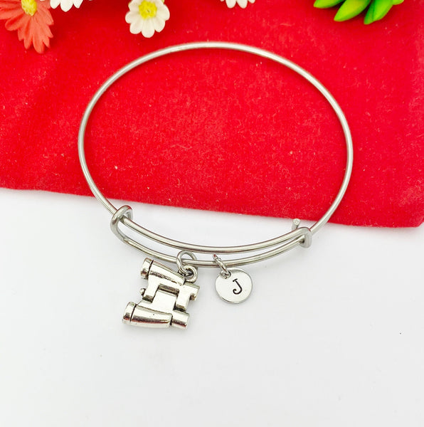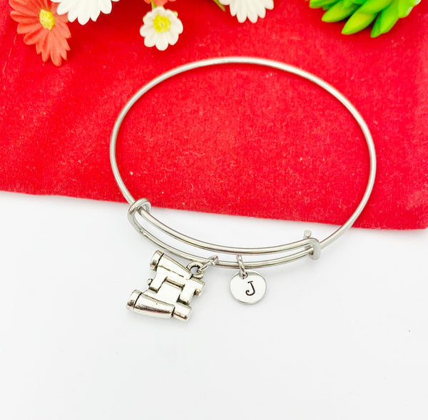 This is a silver -tone binocular charm with hand stamped initial charm on bangle.