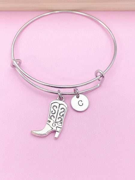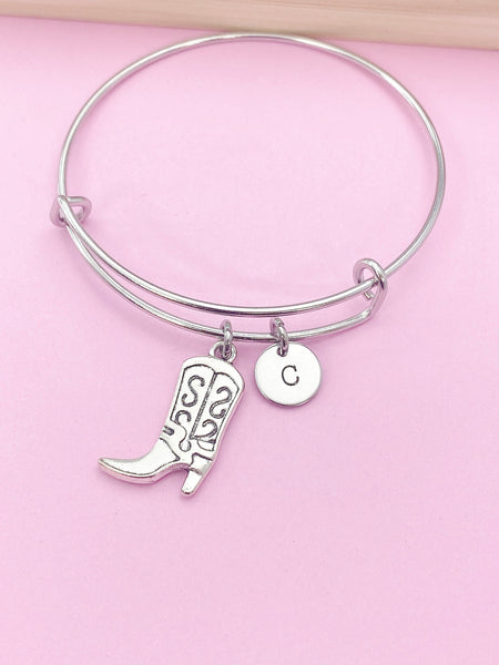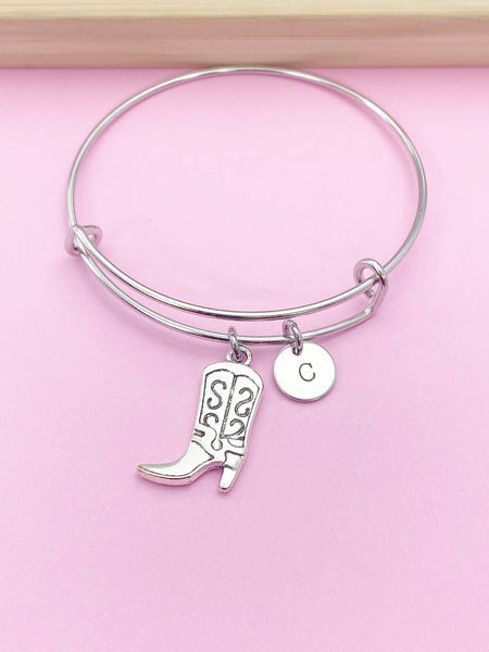 This is a silver-tone boot charm with hand stamped initial charm on stainless steel bracelet bangle.