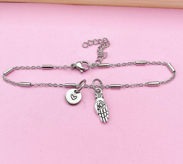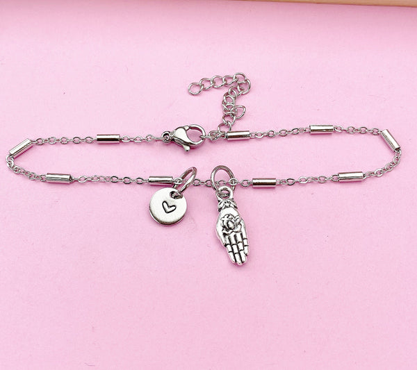 This is a silver-tone Buddha Palm Hand charm with hand stamped initial charm on Tarnish Resistant stainless steel bracelet.