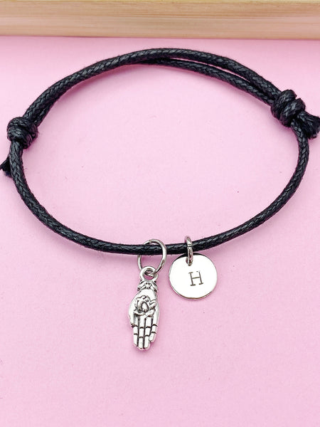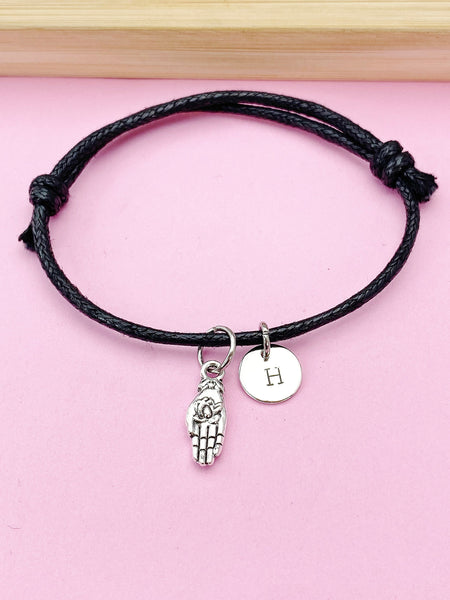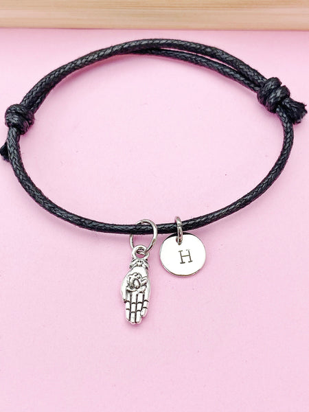 This is a silver-tone Buddha Palm Hand charm with hand stamped initial charm on Adjustable Waxed Cord Bracelet.