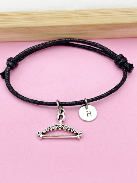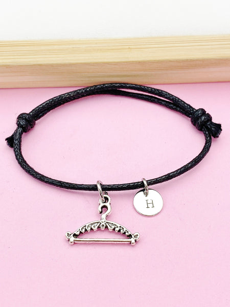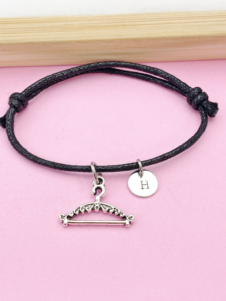 This is a silver-tone Clothe Hanger charm with hand stamped initial charm on Adjustable Waxed Cord Bracelet.