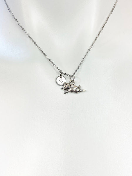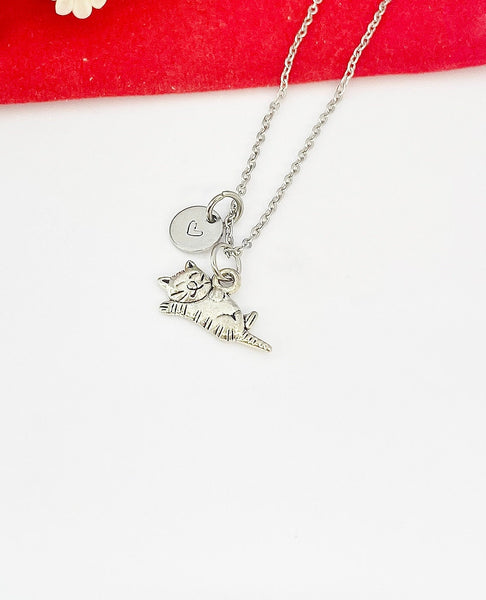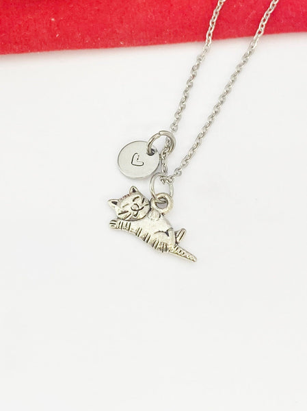 This is a silver -tone cute cat charm with hand stamped initial charm on stainless steel chain.