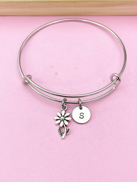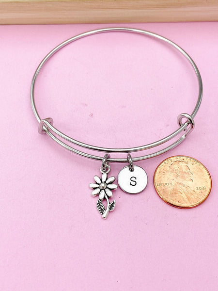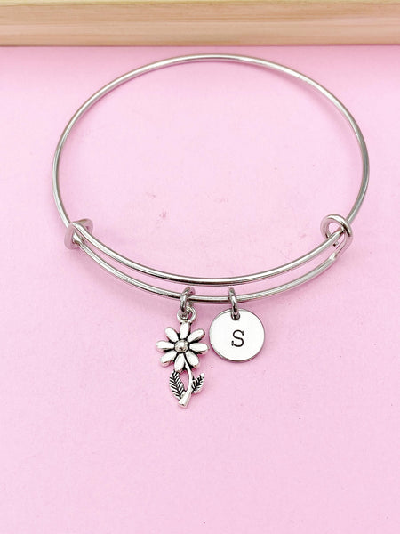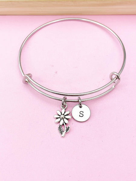 This is a silver-tone daisy charm with hand stamped initial charm on Tarnish Resistant stainless steel bracelet.