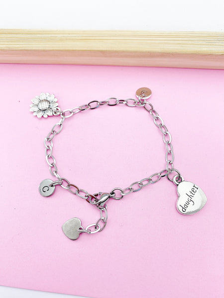 This bracelet features a silver-tone daughter charm and sunflower charm and a hand-stamped initial charm on a stainless-steel chain.