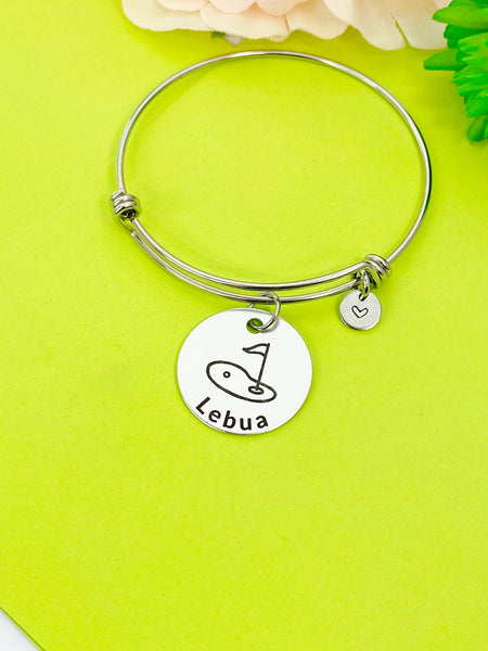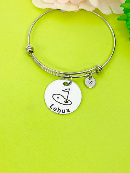 This is an engraving Golf and name on stainless-steel or aluminum with hand stamped heart charm on stainless steel bangle or necklace or split key ring optional.